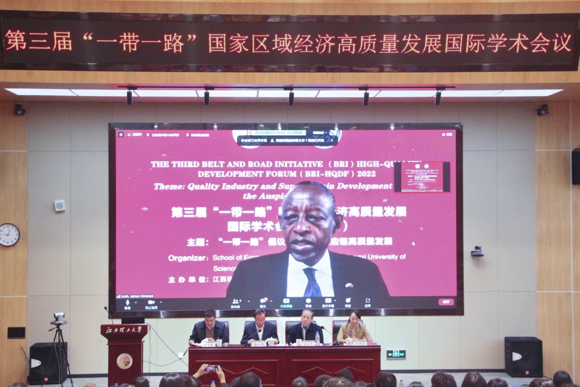 2022年11月19日,卢旺达驻华大使詹姆斯·基莫尼奥以视频形式参加了由江西理工大学主办的第三届“一带一路”国家区域经济高质量发展国际学术会议。