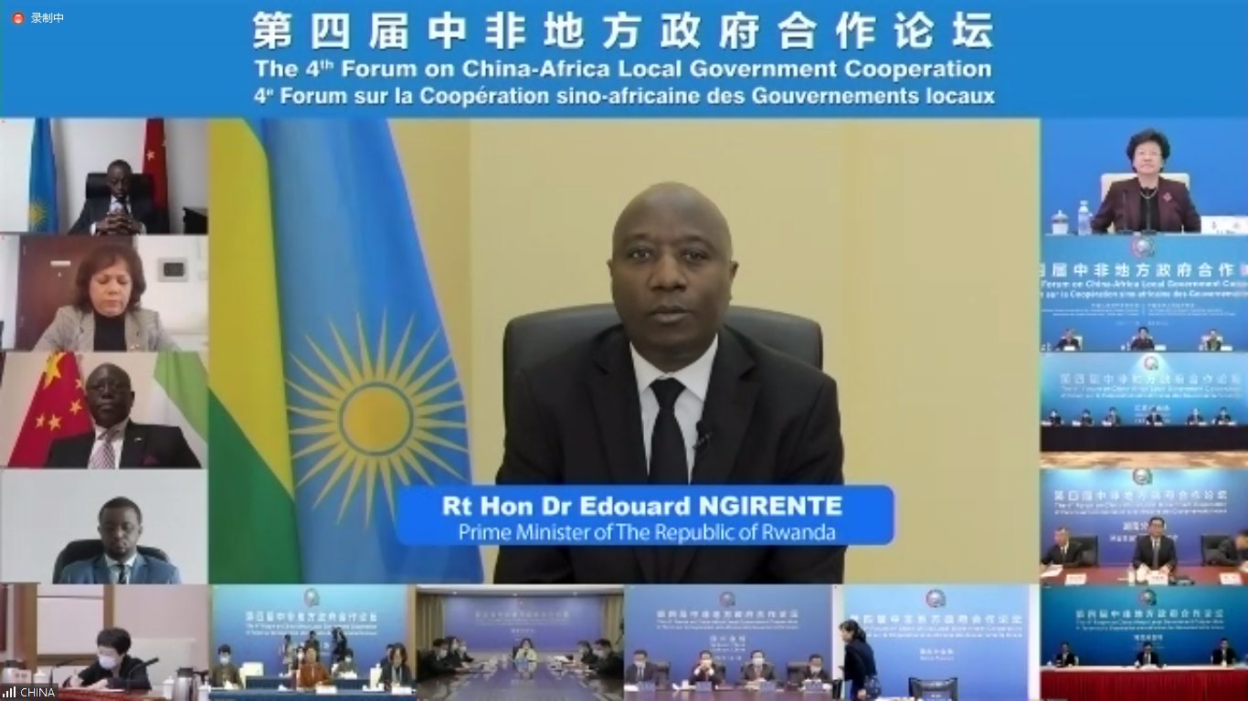 2021年11月16日,卢旺达共和国总理爱德华·恩吉伦特阁下以视频方式在中国人民对外友好协会举办的第四届中非地方政府合作论坛上致辞。